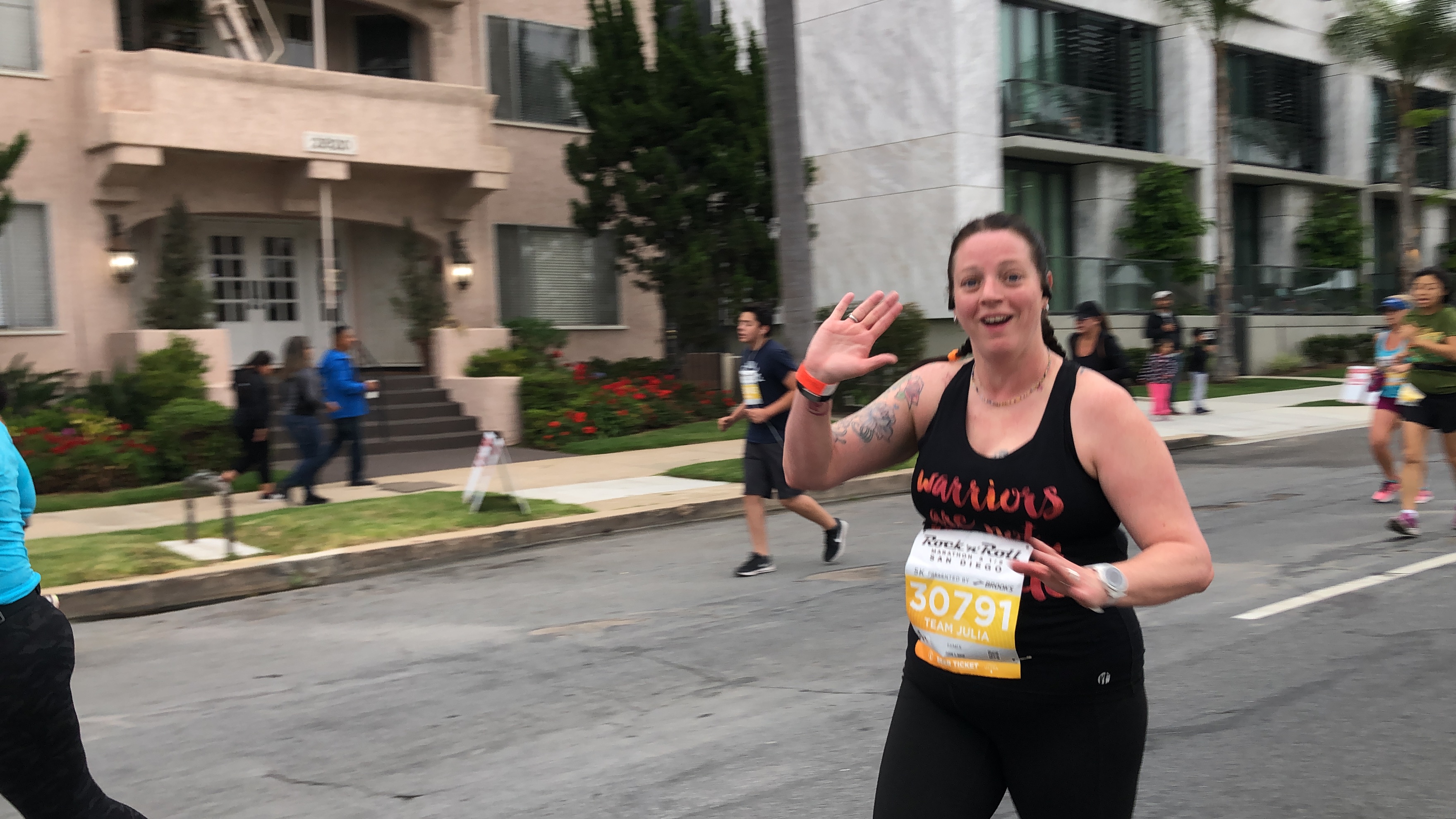 I can’t say that I remember a lot of that first part of the race for me. The support and love shown by the communities of Hillcrest, North Park, and Normal Heights was some of the best showing I have ever seen. So many wonderful people dressed up and sang and cheered for people they didn’t know doing something none of them have likely done, though, it’s possible they are just not running this particular morning in this race. I do remember when we started through the neighborhood though. There were houses where no one was outside watching, there were lots of folks sitting in their front yards waving and cheering. And then there were the spectators who did things for the runners. I must have passed so many people giving out shots and drinks, fruit and waters. It was so cool to see so many people who loved the show. I of course, had to stop at the bar that was serving mini shot servings of mimosas. I grabbed an orange slice from somewhere else. And then around mile 4.5 I came to the spot I had been somewhat dreading since I heard about it.
