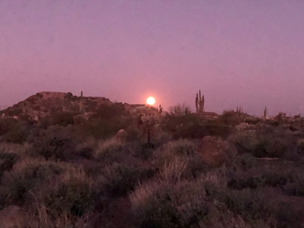 They national anthem is belted out by a 12 year old who sounded amazing!! They lit fireworks for it, I was stunned to be honest. How fucking cool is that? And then it’s time to go. So many runners go by, I tried to start in the back of the pack, and yet, I was so far behind the vast majority of the other runners. The miles came easy. I was so happy to have found my stride, I felt like I was trucking along and things were going my way. I was so loving the music and the view! My goodness, I thought. The desert, though not for everyone, has a certain beauty to it. And then I have a vision of Peter O’Toole, in Lawerence of Arabia, when asked why does he like the desert. Because it’s clean was his response and he’s right. It has beauty all of it’s own, and it’s clean with it’s wild dark purples and bright orange sunlight. Quite stunning really, and the photos don’t do it justice. I remember thinking about how I was looking at the full moon on one side of me and then sunrise on the other side of me and I love when I get to see that. It’s magical really.